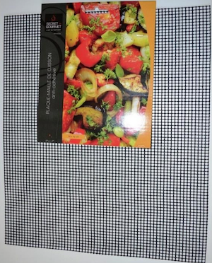 Voici à quoi ressemble cette grille; on peut la trouver presque partout sous le nom de « plaque maille de cuisson »…après, il suffit de la découper aux dimensions de votre socle retourné de la Multi-Délices; très pratique!